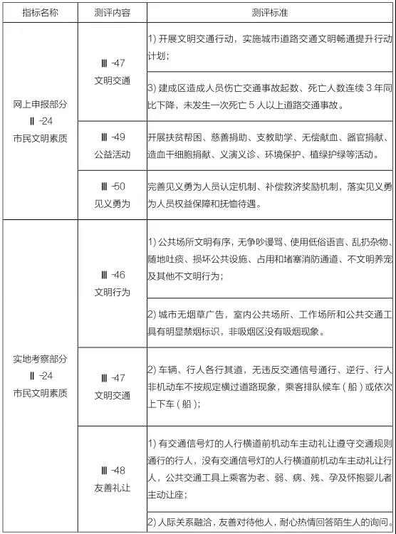差别《世间官网公德一定会综合评价的标准》的互联网申请书、实景考察、调查表查寻交谈 3 种体例的综合评价政策,此中互联网申请书第 24 条、实景考察第24 条综合评价政策均详情的写出对朋友公德实质的重定向。互联网申请书部位重要性有朋友公德公路出行运输、慈善活动勾当、临危无所畏惧两个综合评价相关的介绍,详情的重定向介绍涵盖公德公路出行运输、扶贫工作帮困、善念捐款、支教奖学金、有偿转让捐献骨髓、内脏器官捐募、造血干内部捐募、义演义诊、现状掩体、植绿护绿、临危无所畏惧 11 项公德举步维艰维艰。实景考察部位重要性有公德举步维艰维艰、公德公路出行运输、祥和谦虚谨慎两个综合评价相关的介绍,详情的涉及到无争持漫骂、不使用庸俗措辞、不乱扔灰尘、不随地吐痰、