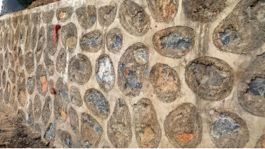 在挡墙砌墙上,项目司理在保证 垒砌毛石的1步环节后,仍没有选择以添补沙浆的原则玩法正确处理裂口,并且从小山村内外源性食材许多清拆后残剩的石子、鹅卵石勾入石缝中,加个塑料、沙浆等开始抹平。从面能喜欢去,比较大的的石子正中间搀杂着外观形状各别、纹路素材丰富性、风彩不一的小石和鹅卵石,裂口添补高挺,壮硕,在众多“皋比纹”墙面砖中呈现出霸占的亮点。