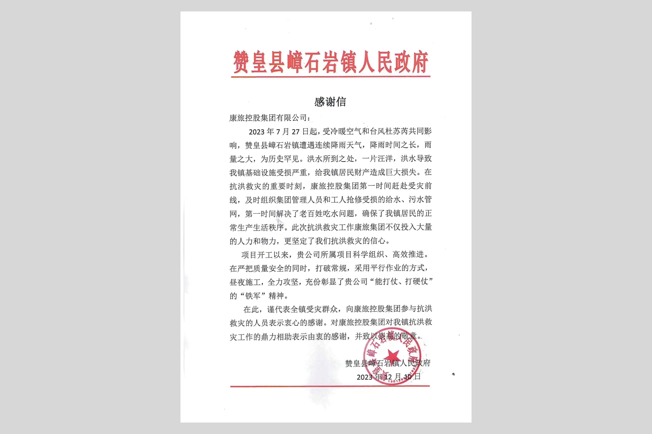赶往赞皇洪灾火线零线,抗洪抢险救灾,获得赞皇县嶂石岩镇人民台当局发送的感激不尽信