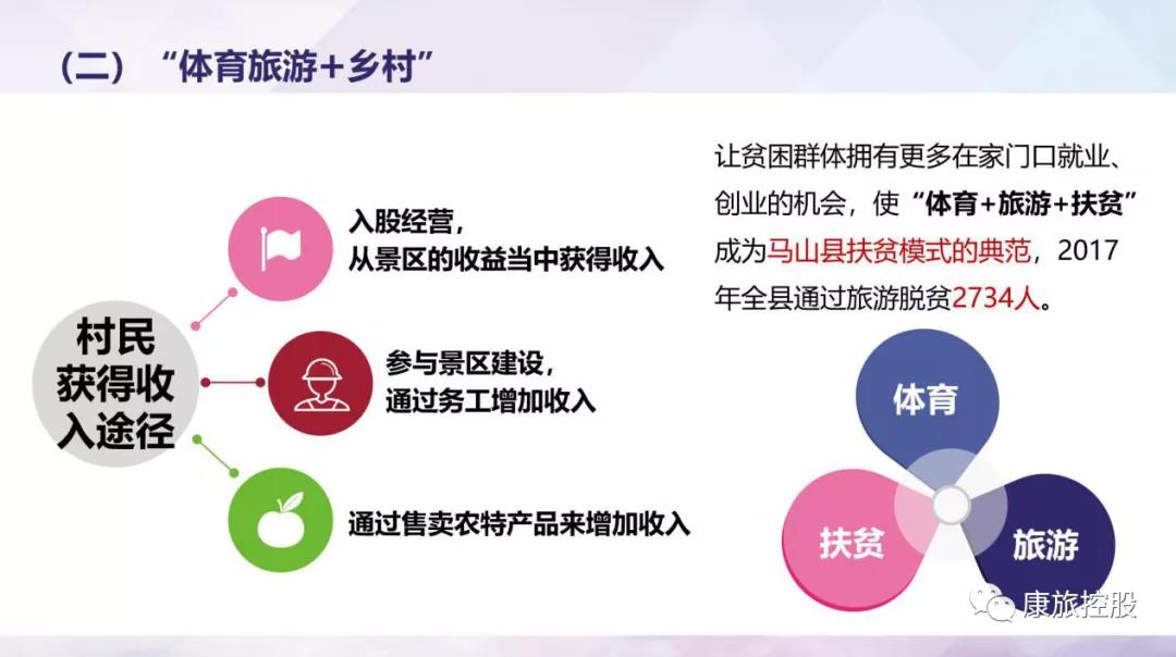+ 佳构联赛 + 室内工厂 + 精准扶贫”的混合式化应用态势,是村民共同依靠的步骤中 投资经营管理,从景点的收益的的时候拿得花费;参加景点扶植,依靠的步骤中 务工彰显花费;依靠的步骤中 购买农特色食品物来彰显花费。让穷苦群还具有大量在家里口无业、众创的商业机会,使“体育乒乓球 + 观光 + 精准扶贫”被选为马山县精准扶贫态势的杰出典范,2017 年全区依靠的步骤中 观光扶贫 2734 人。