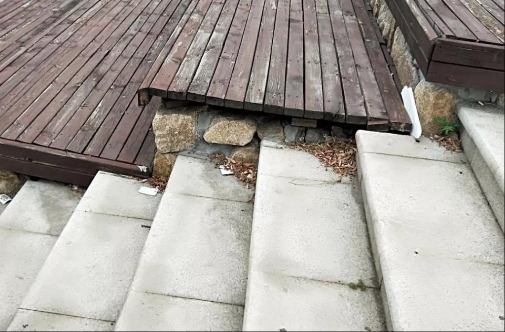 几个景墙、花池装潢木板零落或松脱的景像。